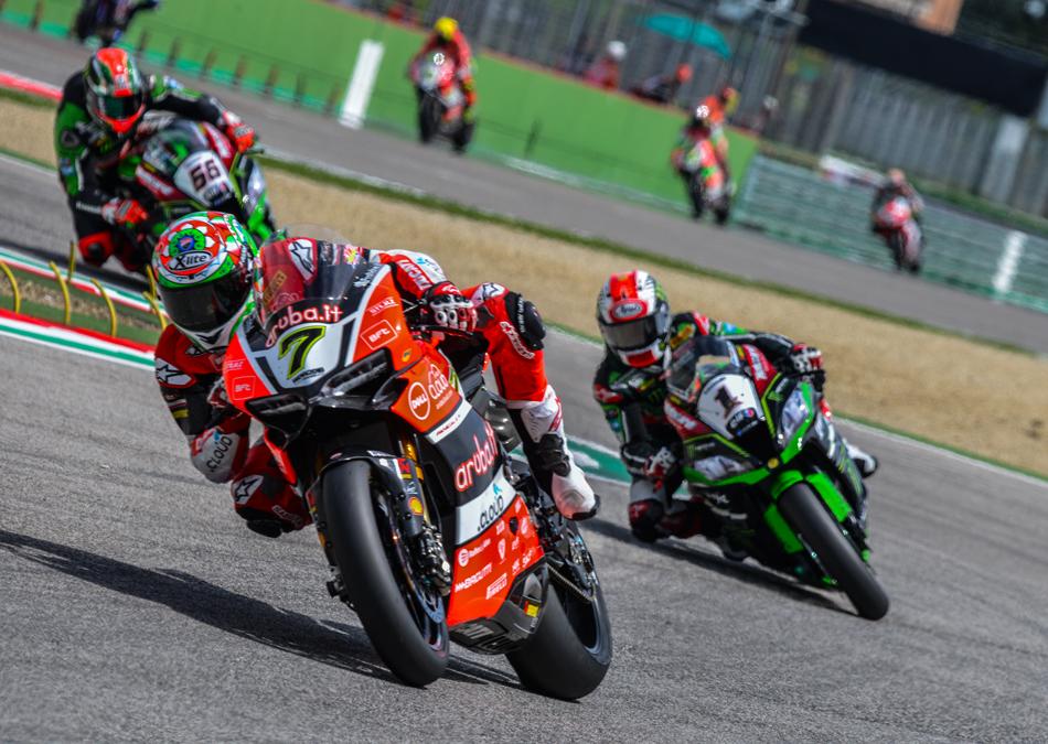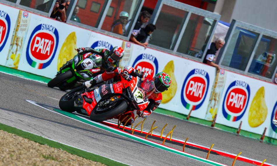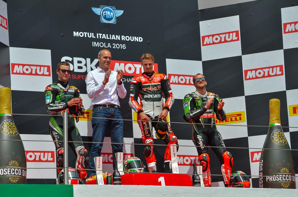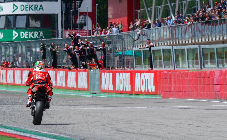 Dopo aver tenuto testa al compagno di squadra Giugliano e alle due Kawasaki, il Gallese della Ducati ha portato a termine una gara perfetta. Dominio rosso sulle rive del Santerno, con le Kawasaki relegate a completare il podio