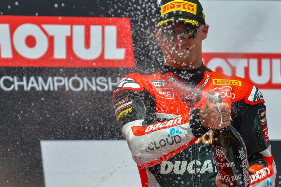 La gara perfetta corsa da Davies ha confinato il duo verde alla lotta per la seconda posizione, con il Cannibale Johnny Rea che è stato anche costretto ad un errore nel tentativo di tenere la ruota dello spilungone britannico del team Aruba. Il campione del mondo in carica si è dovuto accontentare di battere il rivale in Kawasaki Tom Sykes, che non è riuscito ad insidiarlo mai realmente per il secondo gradino del podio.