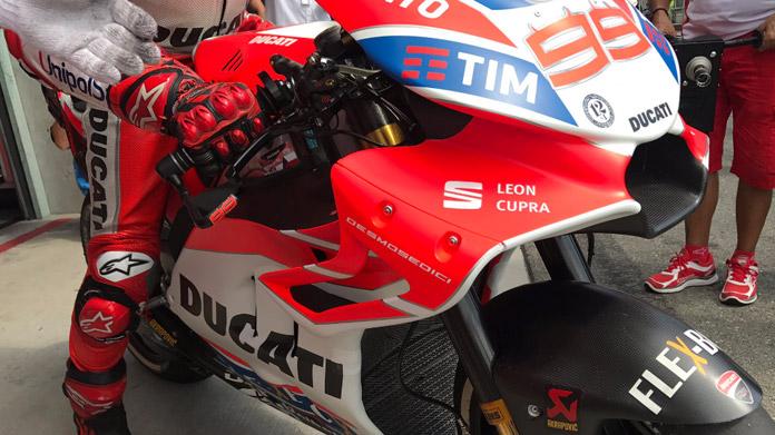 Le foto sono iniziate ad apparire in modo molto centellinato sul profilo ufficiale Twitter Ducati, fino a svelare definitivamente la soluzione. Questa soluzione è stata studiata per aiutare Jorge Lorenzo nella sua perenne ricerca di maggior feeling nell’anteriore della moto, vero punto debole in questo momento del binomio formato dallo spagnolo e dalla Ducati GP17. Danilo Petrucci aveva portato in pista questa soluzione a Misano durante i test privati di luglio, rivelando di aver trovato degli ottimi riferimento con la nuova veste aerodinamica e confermando che grazie a questa soluzione la moto sembra più stabile sull’anteriore, caratteristica fondamentale per restituire la fiducia perduta a Jorge Lorenzo.