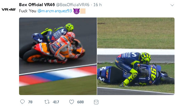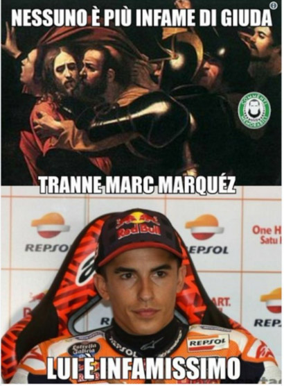 Animi caldi nel post Argentina. Dopo l’hashtag #TermasClash sui social iniziano a spuntare le prime reazioni dei tifosi sull’episodio che ha visto coinvolti Marquez e Valentino Rossi. In questo clima rovente spuntano foto di Marquez sugli autoscontri e addirittura un fotomontaggio dove il pilota spagnolo è inserito in una foto d’epoca dell’aviazione giapponese durante la Seconda Guerra Mondiale, ad indicare il suo spirito da kamikaze nella gara a Termas de Rio Hondo. L’account del Box Official VR46 ha poi postato una foto che non ha bisogno di commenti “Fuck 93”. Su twitter è poi nato l’account “Uccio che caccia Marquez”.