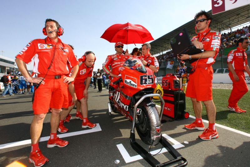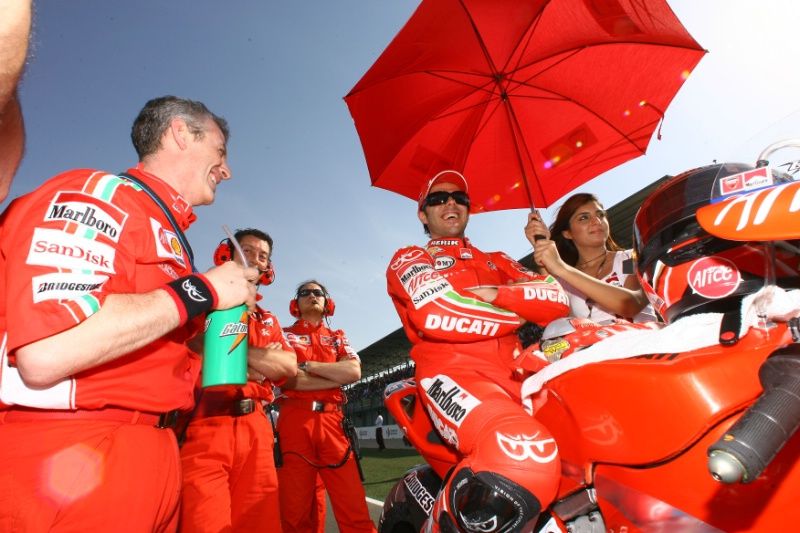 Loris Capirossi fu il primo a mettere le mani sulla Desmosedici in versione 800, durante i test post gran premio a Brno, in Repubblica Ceca. Il suo entusiasmo fu così forte che sceso dalla sella entrò nel box e le sue prime parole furono: “Ma che moto avete fatto? Posso averla subito, senza aspettare l’anno prossimo?”. Capirex durante il test aveva girato in pratica sugli stessi tempi fatti nel weekend di gara sulla poderosa Desmosedici GP6 a cilindrata piena. Ma la moto in configurazione 800 era incredibilmente più agile e soprattutto poteva contare su un feeling con le gomme Bridgestone che si rivelò presto l’arma vincente.