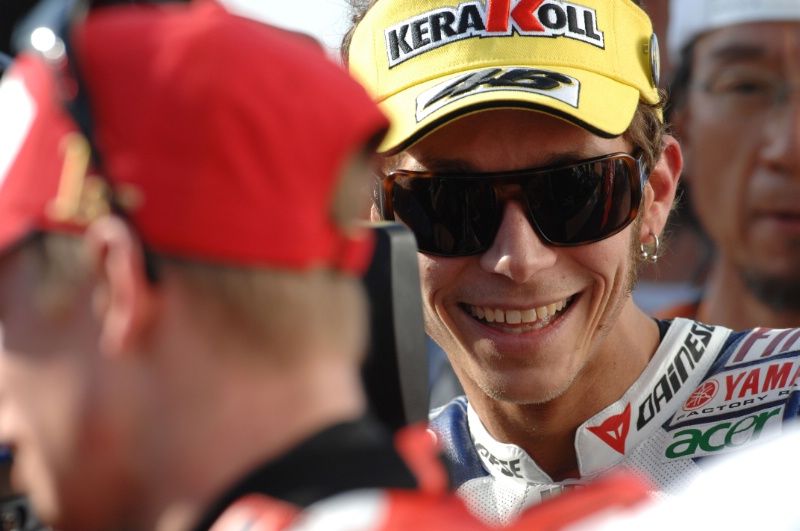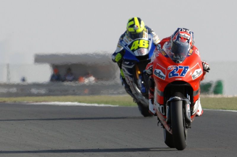 La pole position mise Valentino di buon umore e quel ragazzino sulla moto rossa al suo fianco poteva costituire un problema giusto per il tragitto che portava alla prima curva. In realtà le cose si misero immediatamente in modo totalmente diverso. Stoner era velocissimo in rettilineo e nonostante Rossi facesse valere tutta la sua esperienza per passarlo con precisione ed aggressività nel guidato, il motore della Desmosedici permetteva all’australiano di restituire sempre il favore in rettilineo, tagliando il traguardo costantemente in prima posizione giro dopo giro.
