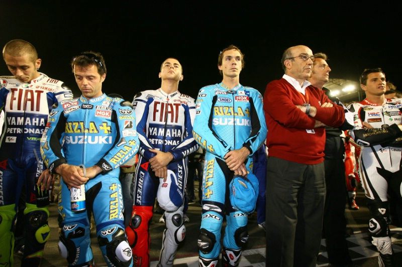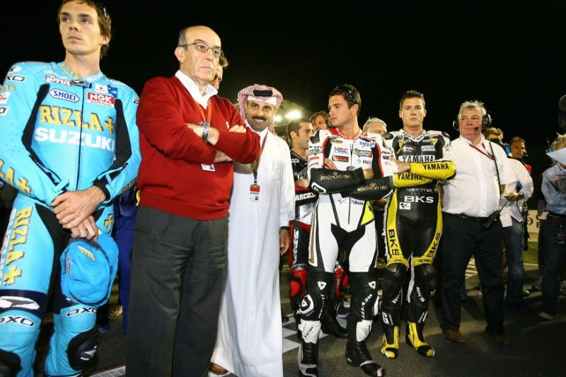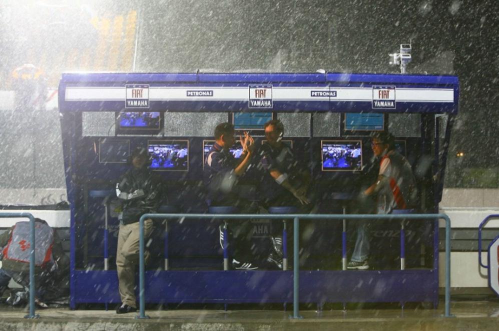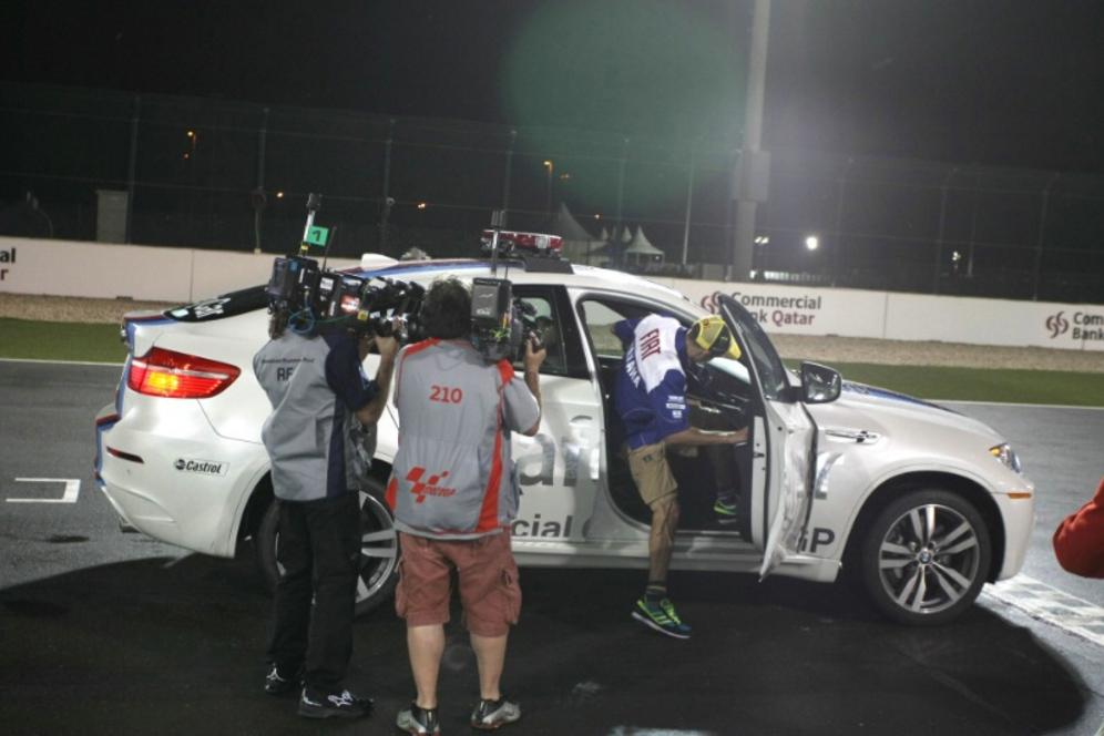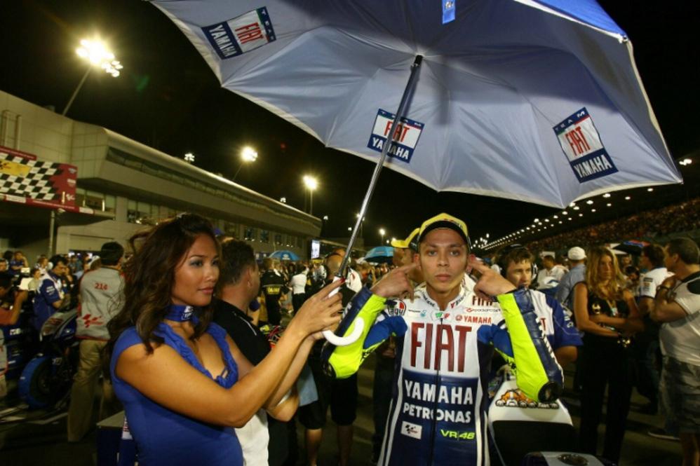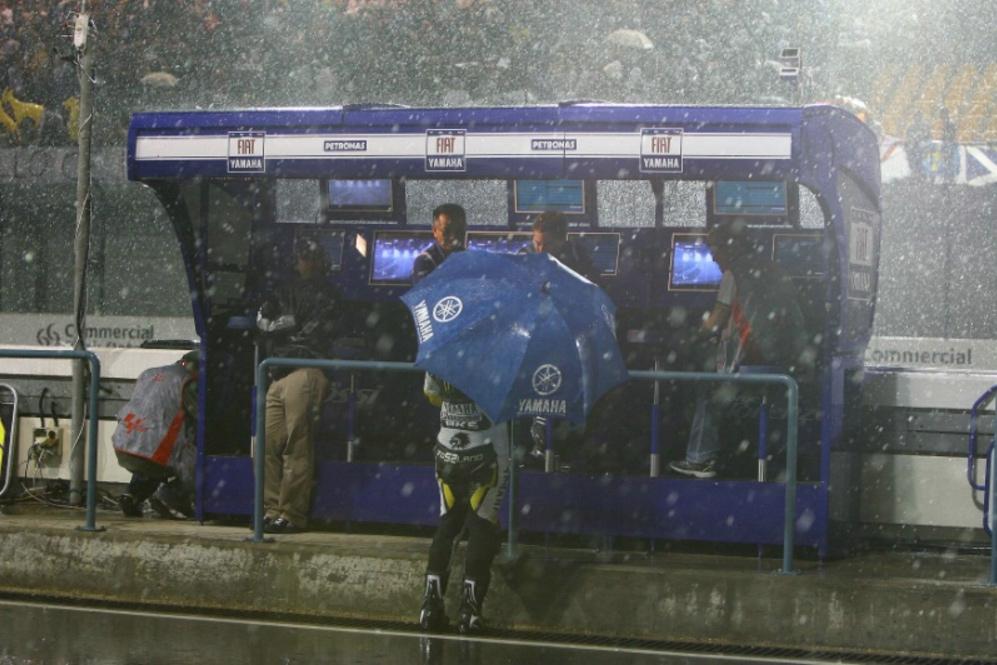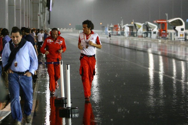 Si arriva alla classe regina: Rossi, Stoner e tutti gli altri sono già in griglia con la pista finalmente asciutta che ecco si apre il cielo e una pioggia fitta e grossa bagna all’inverosimile la pista nel corso di pochi minuti. Tutti di nuovo ai box e i piloti già capiscono che la corsa non avrà luogo. Si riunisce la direzione tecnica ed inizia così una lunga discussione. Alle ore 23.32 arriva la notizia ufficiale: il GP del Qatar si recupererà lunedì 13 aprile alle ore 21.