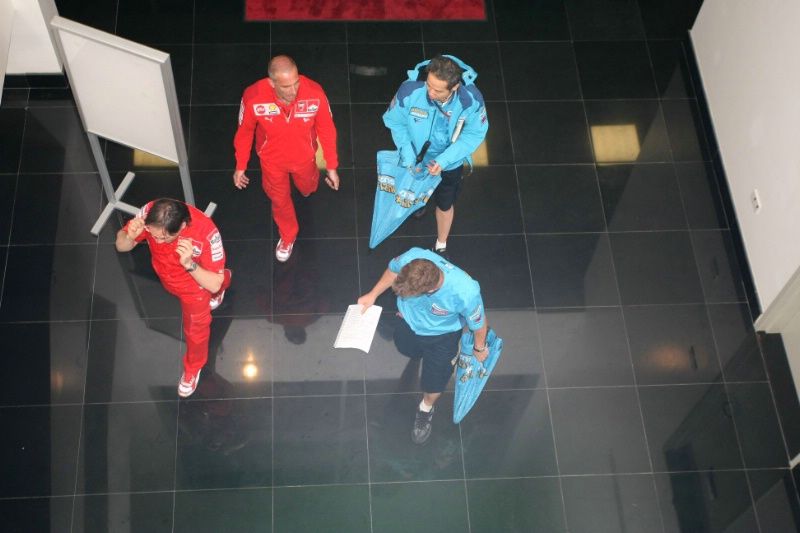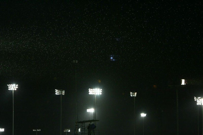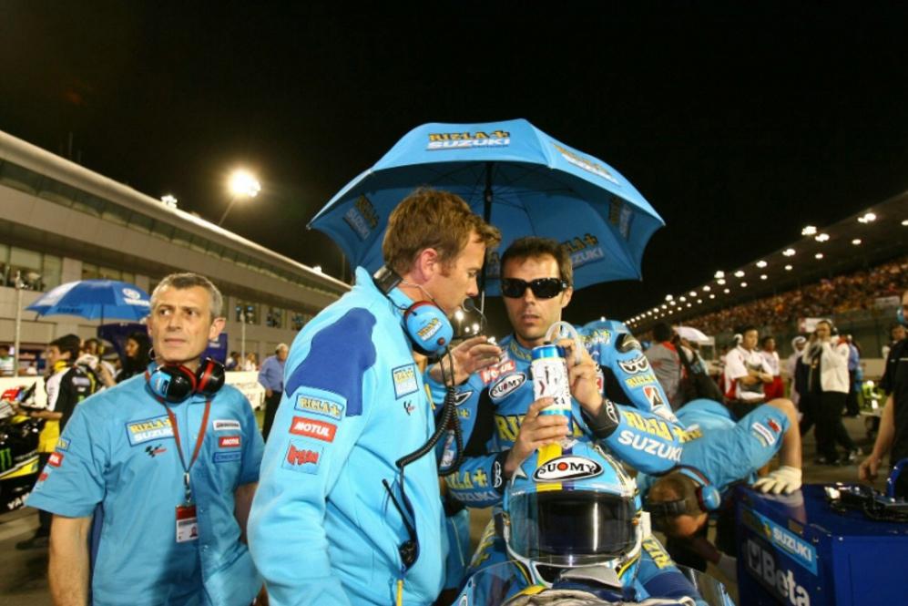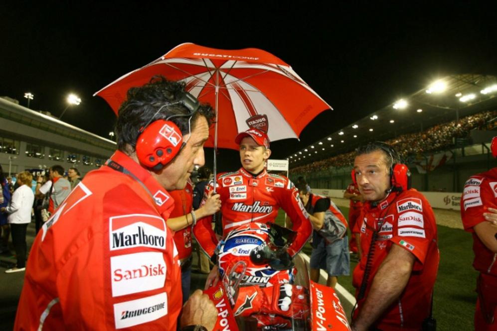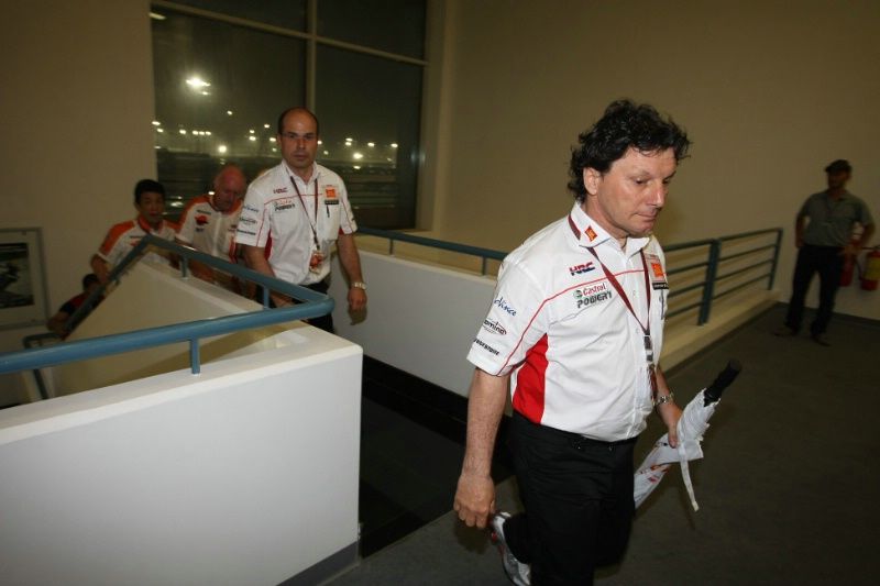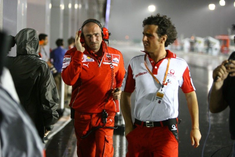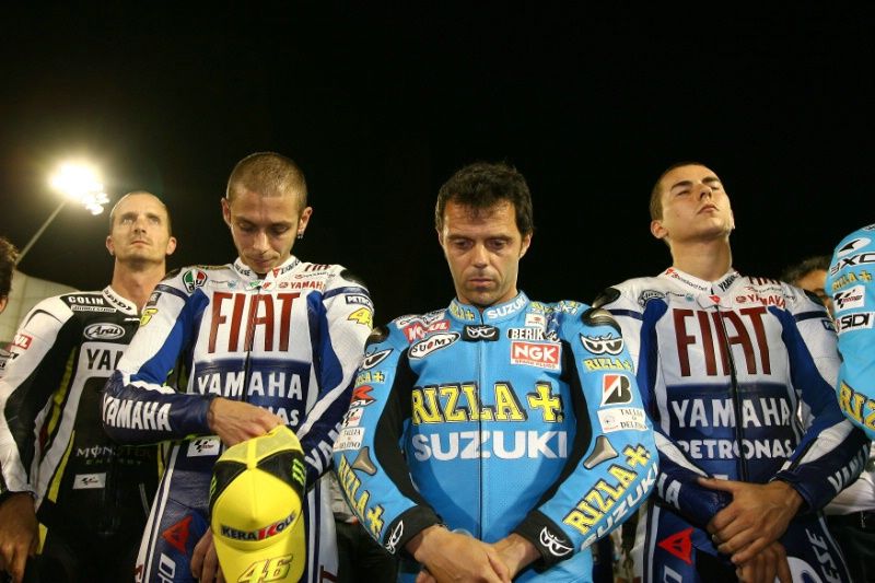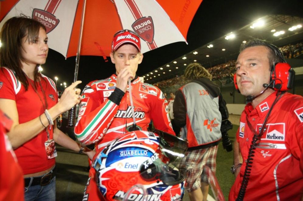 Si arriva alla classe regina: Rossi, Stoner e tutti gli altri sono già in griglia con la pista finalmente asciutta che ecco si apre il cielo e una pioggia fitta e grossa bagna all’inverosimile la pista nel corso di pochi minuti. Tutti di nuovo ai box e i piloti già capiscono che la corsa non avrà luogo. Si riunisce la direzione tecnica ed inizia così una lunga discussione. Alle ore 23.32 arriva la notizia ufficiale: il GP del Qatar si recupererà lunedì 13 aprile alle ore 21.