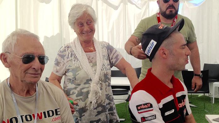 Appena finita gara due siamo andati a complimentarci con Macio e ci aspettavamo di trovarlo con la Manu a festeggiare tra magnum di champagne e musica rock. Invece abbiamo dovuto cercarlo nel retro paddock dove si era rintanato a festeggiare con i Nonni!!! Due giovanissimi, arzilli ed emozionati signori che avevano appena assistito al trionfo del nipote. Appena arrivato mi ha invitato a conoscere i nonni che dopo tanto tempo gli avevano chiesto di poter assistere ad una sua gara. E mi ha spiegato che forse gli avevano anche portato fortuna!