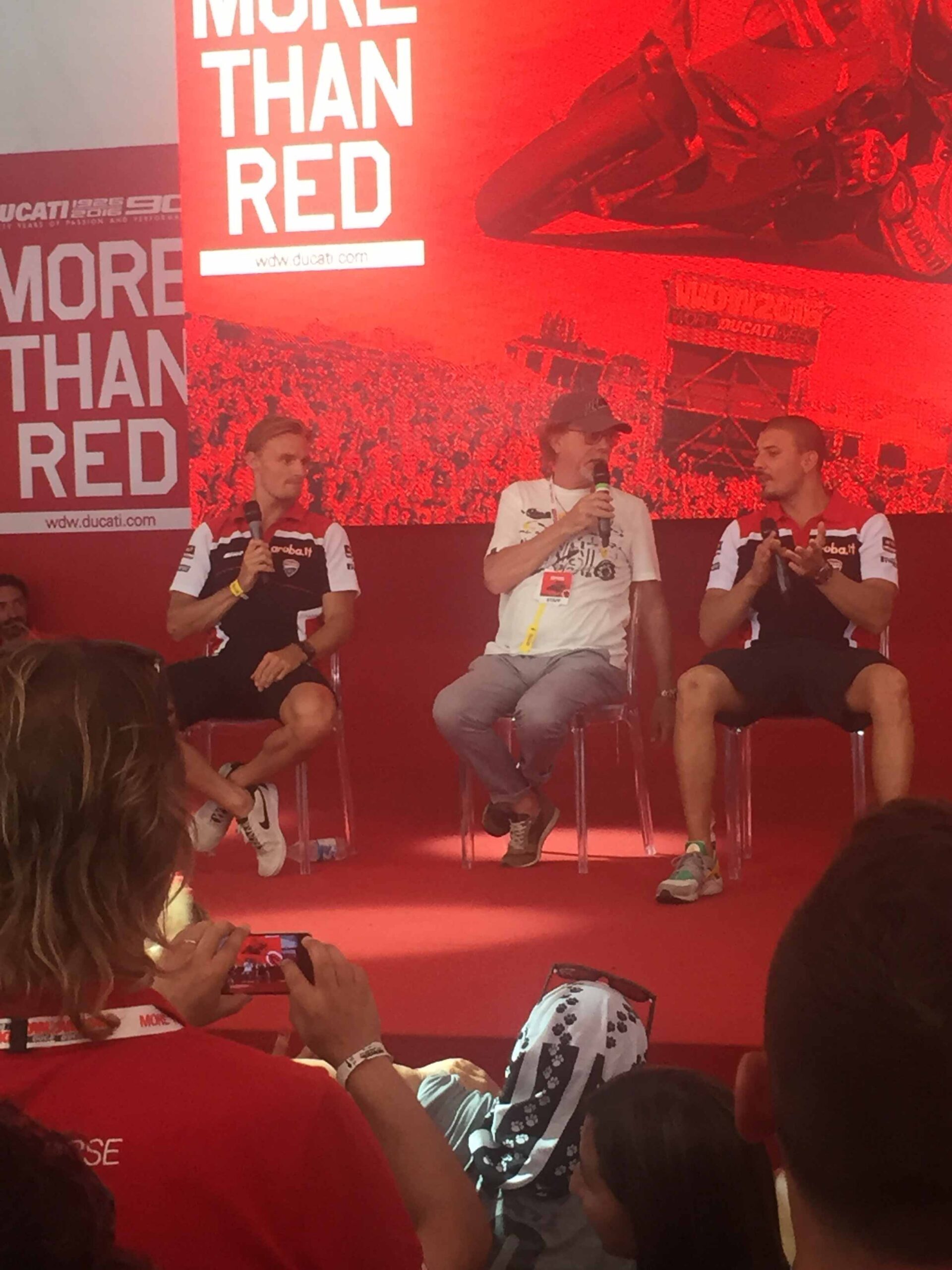 Molto interessante è stata l’intervista di Giovanni Di Pillo ai piloti SBK Chaz Davies e Davide Giugliano, entrambi sono stati divertenti, soprattutto Davies col suo strano italiano e hanno sottolineato quanto l’amore dei tifosi per la Ducati sia qualcosa che non si respira con le altre case e quanto sperano entrambi di vincere, in risposta alla grande efficacia delle Kawasaki. Davies ha dichiarato di amare Laguna Seca, dove si terrà la prossima tappa del Mondiale SBK, una pista unica al mondo dove il pilota in passato è stato molto veloce. Dal canto suo Giugliano ha ricordato con un battuta la sua caduta proprio negli Stati Uniti e spera di rifarsi quest’anno.